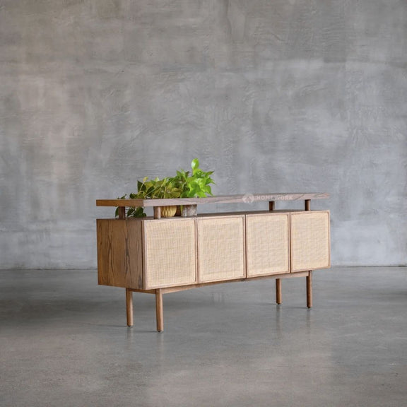 AALAM Console combines natural elegance with modern design. Its wooden frame features a warm finish, highlighting the wood's grain. The front showcases four woven rattan panels, adding rustic charm. Elevated on slender legs, it has an airy appearance. The spacious top is ideal for decorative items, while the storage behind the rattan doors keeps your space organised. This versatile console suits entryways, living rooms, or dining areas, offering both style and functional
