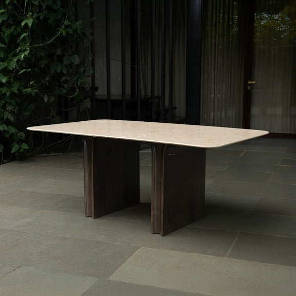 Discover the serene beauty and robust craftsmanship of the Aether Dining Table. This striking piece features a generous, smooth Rectangular Travertine top, celebrated for its unique porous texture and soft, earthy tones that bring an organic warmth to any space.