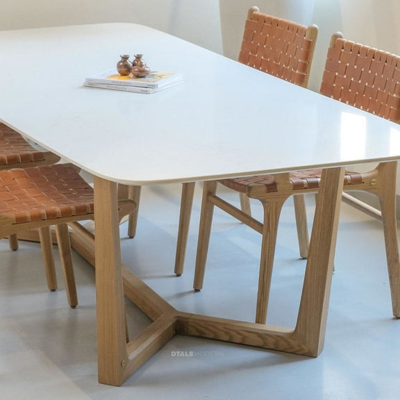 The Calissa dining table features a striking and elegant design that effortlessly combines natural elements and refined aesthetics. The tabletop is crafted from Quartz that has a smooth surface which showcases delicate patterns creating an exquisite display. The table's legs, made of rich, warm wood, catch the eye with their unique configuration. Instead of standing straight, they lean slightly inwards, creating a subtle and intriguing visual effect. The inclination of the legs gives the table a touch of modernity and originality, setting it apart from more traditional designs. As the legs converge towards the bottom, they seamlessly join to a central beam.