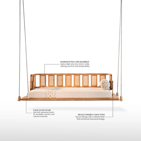 Crafted from solid wood, the Nila features a beautiful backrest with intricate cane detailing that adds a touch of natural, rustic charm. The plush, upholstered mattress and bolster cushion invite you to sink in and unwind. Hanging from sturdy metal chains, the swing creates a gentle, soothing motion that will make you feel like you're floating on a cloud.