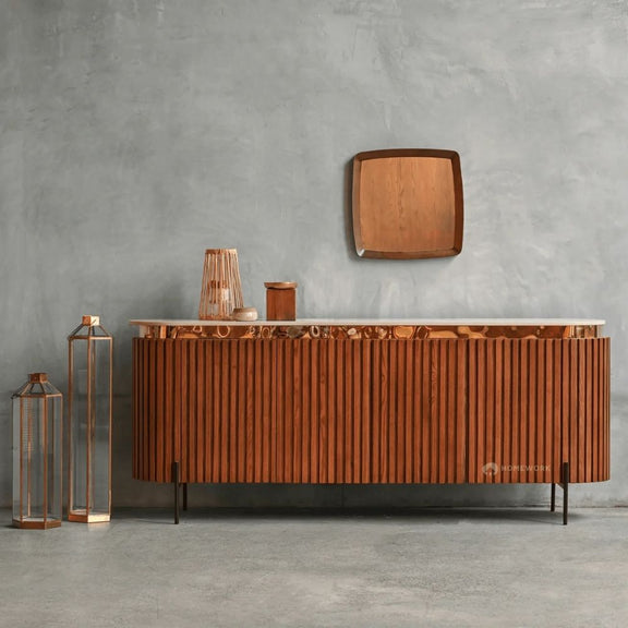 Rubi Console is a statement piece that combines elegance with functionality, perfect for enhancing any interior space. Crafted with precision, this console features a beautifully textured front with vertical wooden slats, giving it a distinctive and refined look. The rich, warm wood tones are complemented by a sleek brass accent that runs along the top, adding a touch of sophistication. Supported by minimalist black metal legs, the Rubi Console offers stability while maintaining a light and airy feel. Ideal for entryways, living rooms, or dining areas, this console provides ample storage and surface space, making it both a stylish and practical addition to your home decor