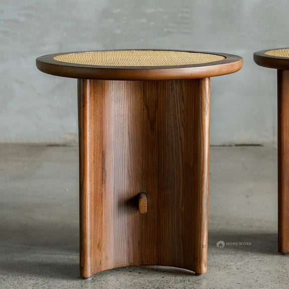 Seren Side Table is a part of the Seren Collection. The table features a rounded top finished with a smooth rattan surface, providing a natural and elegant texture. The body of the table is crafted from ash wood, showcasing a sleek, curved design that exudes a sense of calm and sophistication. The wood grain is visible, adding a touch of organic beauty to the piece. A small wooden peg detail on the front enhances the table's minimalist aesthetic, contributing to its serene and timeless appeal. This side table is designed to complement various interior styles, bringing a touch of nature and tranquility into any space